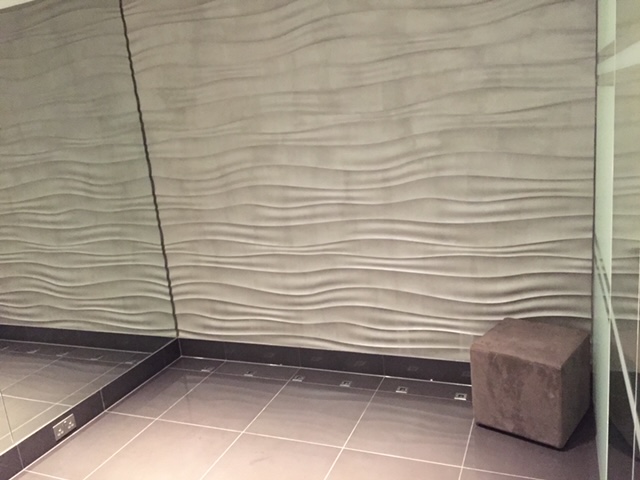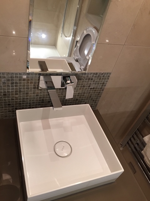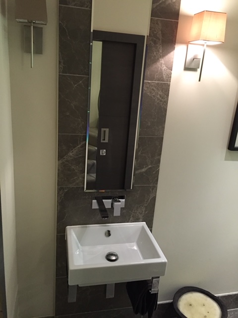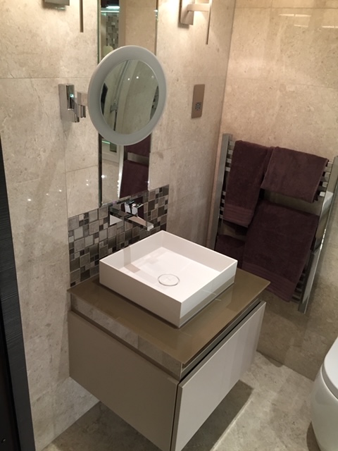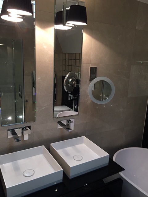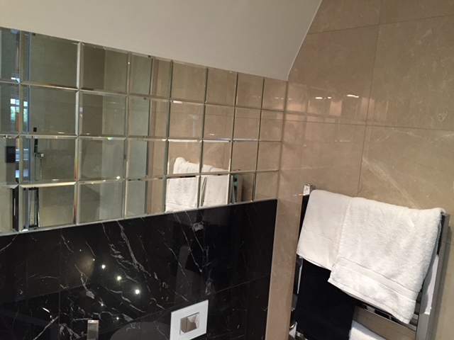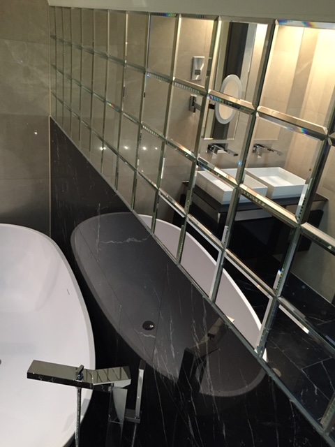 The first bathroom is a stunning example of sleek, contemporary design. It features a freestanding, oval-shaped bathtub that serves as the centrepiece, combining elegance with comfort. The black marble wall with subtle veining adds a touch of opulence, perfectly contrasted by soft beige tiles that create a warm and inviting atmosphere. A wall-mounted square basin with clean lines and polished chrome taps enhances the minimalist aesthetic. The mirrored wall not only amplifies the sense of space but also reflects natural light, creating a brighter and more open feel.