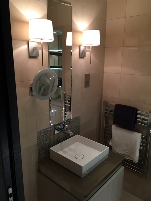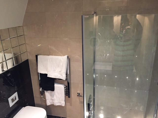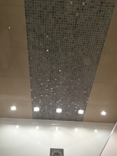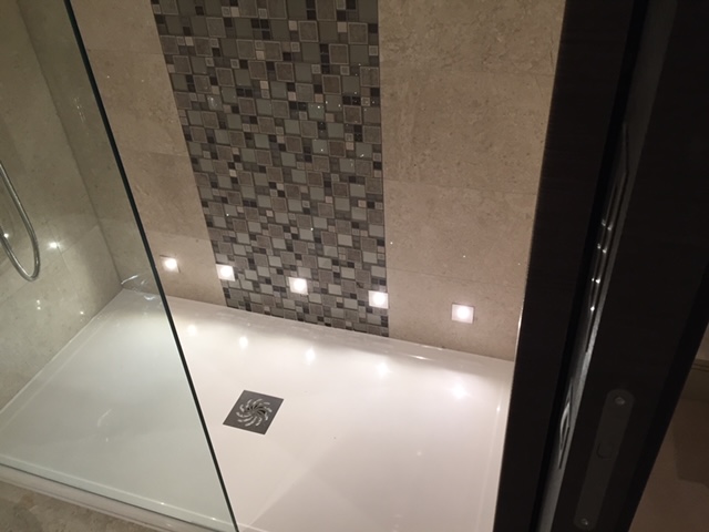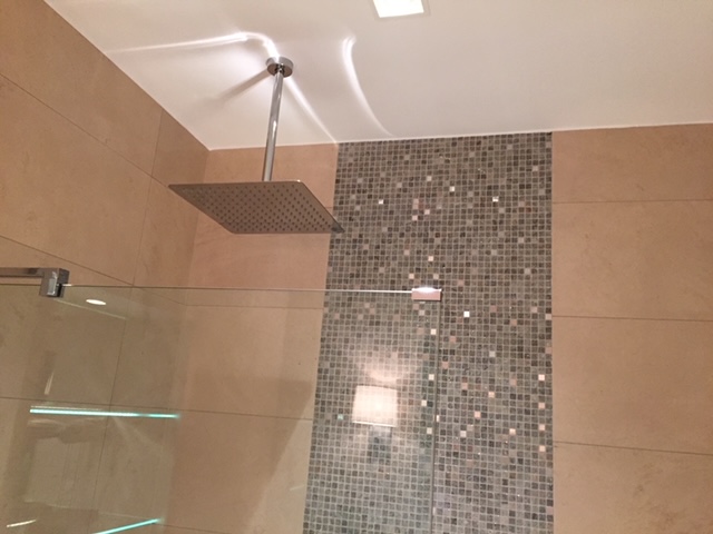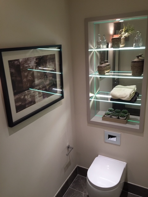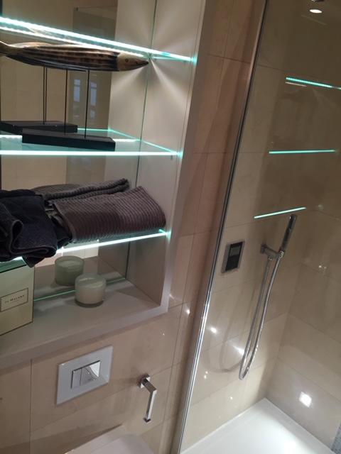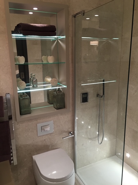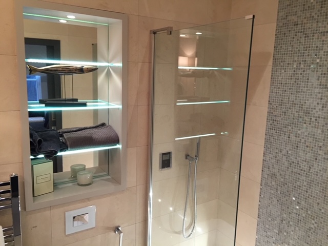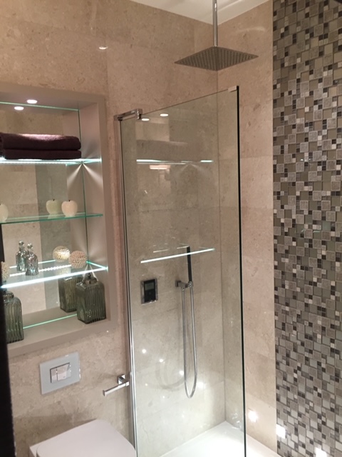 The second bathroom focuses on functionality and style, with a spacious walk-in shower fitted with frameless glass panels. The rainfall showerhead promises a spa-like experience, while the mosaic tile strip running down the wall adds visual interest and texture to the design. Recessed LED-lit shelving provides storage for toiletries and decor, seamlessly blending practicality with sophistication. Neutral tones dominate the colour scheme, creating a calming and timeless ambience.